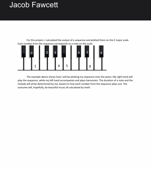 Jacob Fawsett is playing a sequence on piano and Jacob is improvising on playing Pi and Jacob's Music Sheet and README and Zakaria Sohrabi playing Fibonacci sequence on violin and Zak's Sheet Music and Zak's README.txt